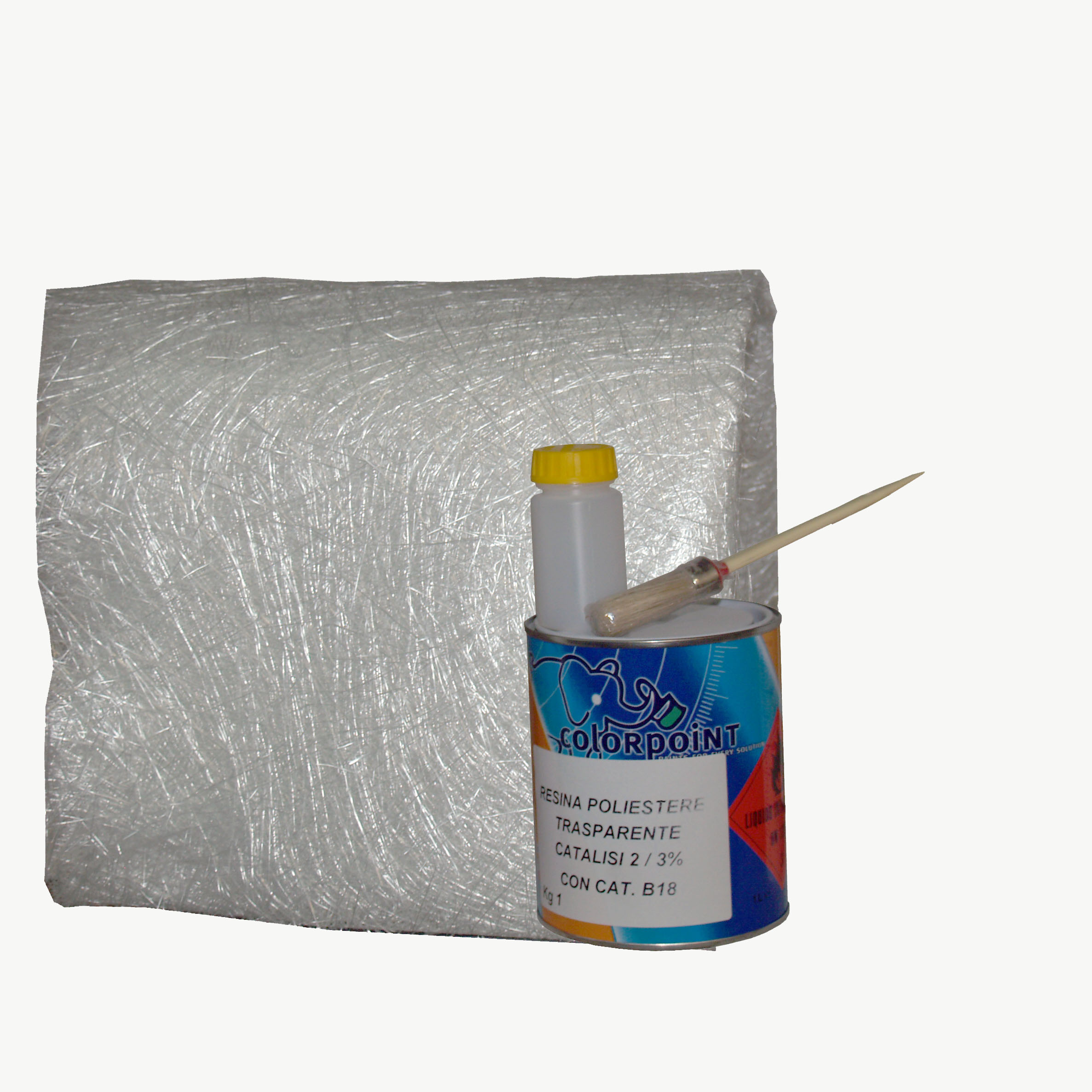 Comprende: 1 Kg di resina poliestera trasparente,vaschetta di catalizzatore, pennello, lana vetro da mq. 1.